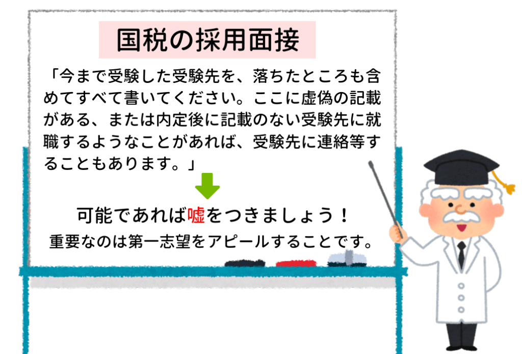 これから受ける皆様は、嘘でもいいので「国税が第一志望(専願)」ということを伝えてほしいと思います。